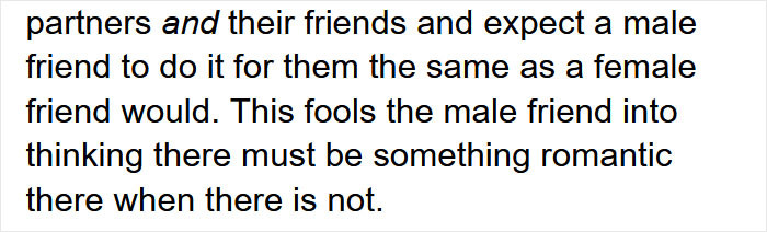 In the end, both parties become confused and perhaps even hurt. Men suffer from being conditioned in this way, while women struggle because they cannot connect with male friends for basic friendship.