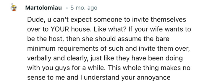 OP's wife then took the opportunity to blast them for ignoring her previous hints about them coming over for a change. She further expressed her frustration to OP, who was taken aback by what he perceived as an unnecessary "set-up."