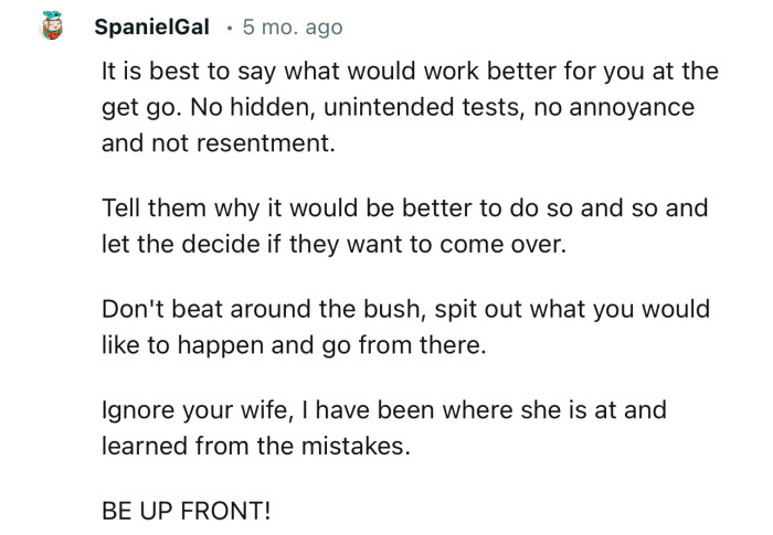 "It is best to say what would work better for you at the get-go. No hidden, unintended tests, no annoyance, and no resentment."