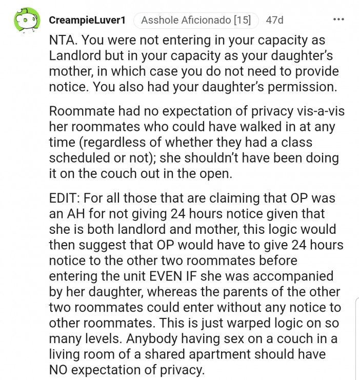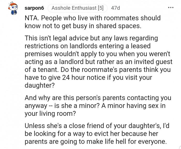 Well, it wasn't long before OP was contacted by the girl's parents, who were threatening legal action for breaching their daughter's privacy. But what made the entire scenario more interesting was that the man in question was the boyfriend of the second roommate.