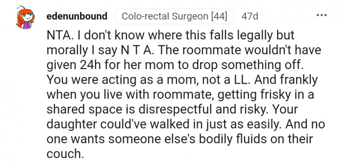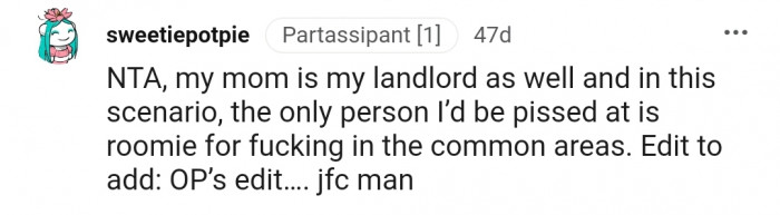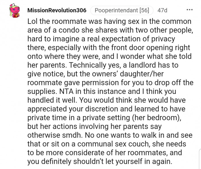 "In this scenario, the only person I’d be pissed at is the roomie for fu*king in the common areas."