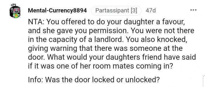We'd love to hear your thoughts on this situation. Do you think OP was wrong to enter without waiting to be let in, or do you think the girl's parents were overreacting?