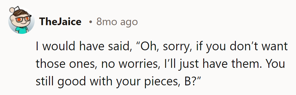 "I bought the pizza, so I get to pick my slices first, and I wanted these ones."