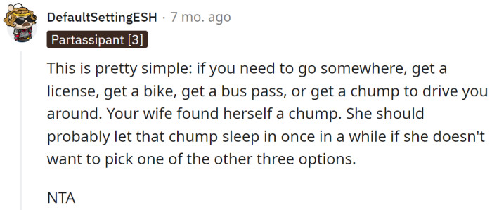 RedditBut his wife does not have a driver's license, which causes more duties for him: