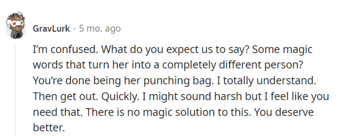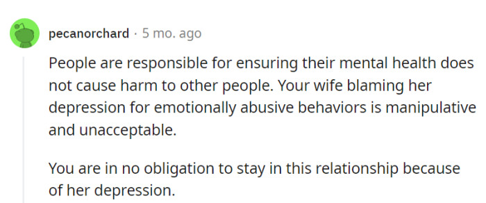She blamed her behavior on depression, a demon she acknowledged but refused to confront. Despite her successful facade in the outside world, inside their home, she was a ticking time bomb, detonating her frustrations upon OP, her unwilling punching bag.