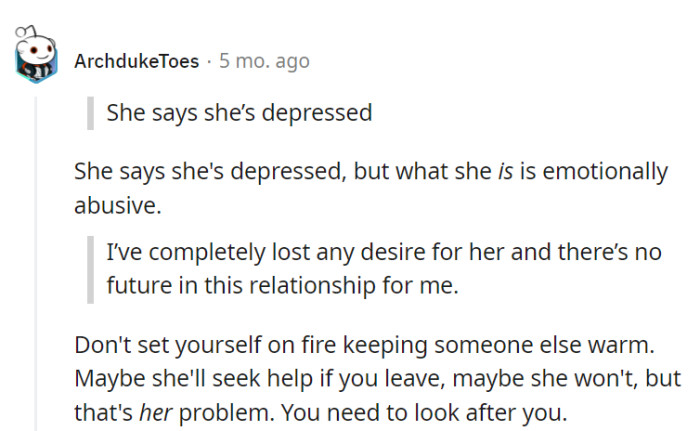 RedditHe wants to help her, but he can't continue in this situation, and he's lost his desire for her, seeing no future in their relationship if she refuses to seek help.