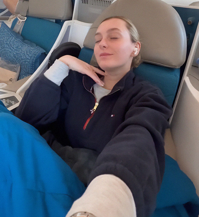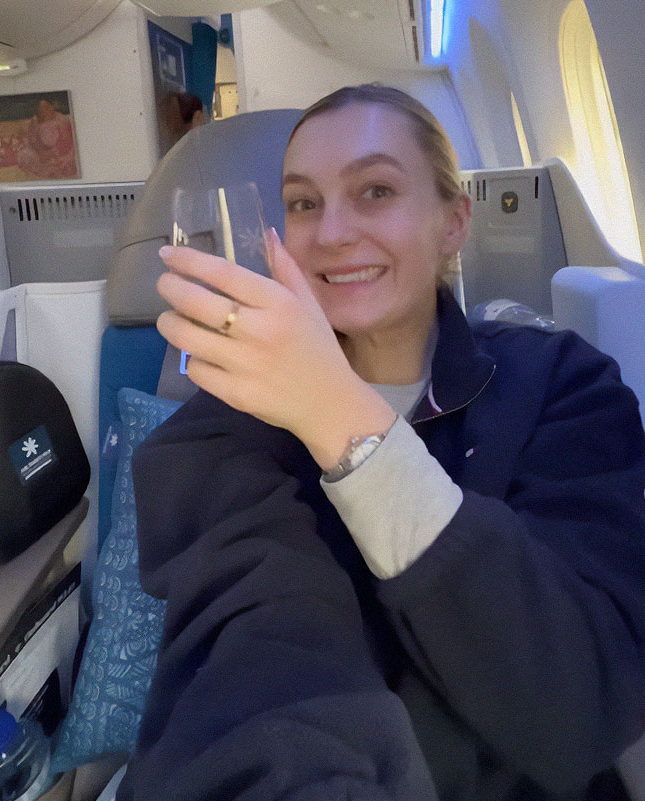 "Rob jokingly said that my business class seat would be the final part of my push present, so naturally, I accepted it. I couldn't just pass it up," Ellis explained. She mentioned that while she could have done without the fancy food, including risotto and fish dishes followed by macarons, she did manage to enjoy an "amazing nap."