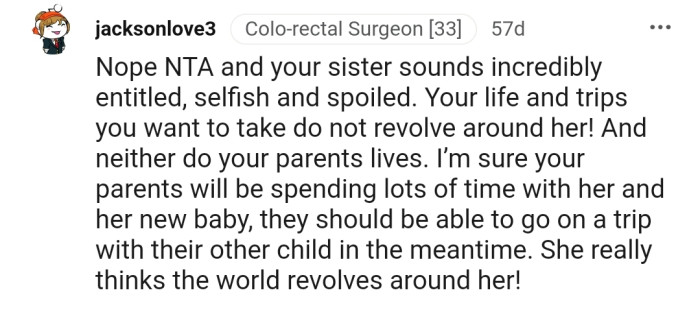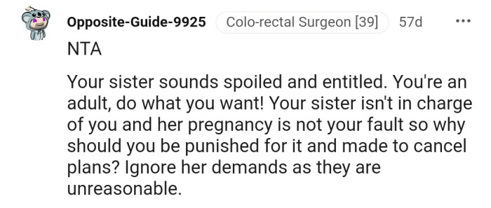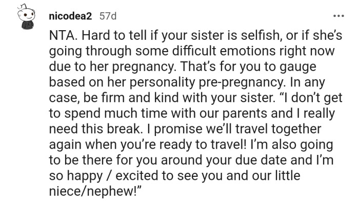 Reddit.comOP's sister and her husband are expecting a baby soon. However, she isn't happy about the fact that her condition will prevent her from traveling with OP and the family.