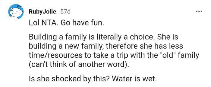 "Lol NTA. Go have fun. Building a family is literally a choice."