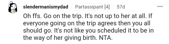 "Oh ffs. Go on the trip. It's not up to her at all."