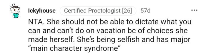 "She should not be able to dictate what you can and can’t do on vacation because of choices she made herself."