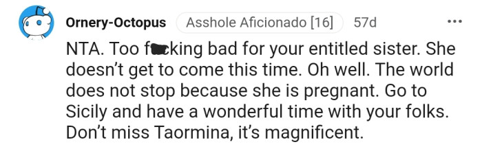 Reddit.comOP and his parents are planning a trip to Sicily. His sister learned about it and is now demanding that they cancel the trip.