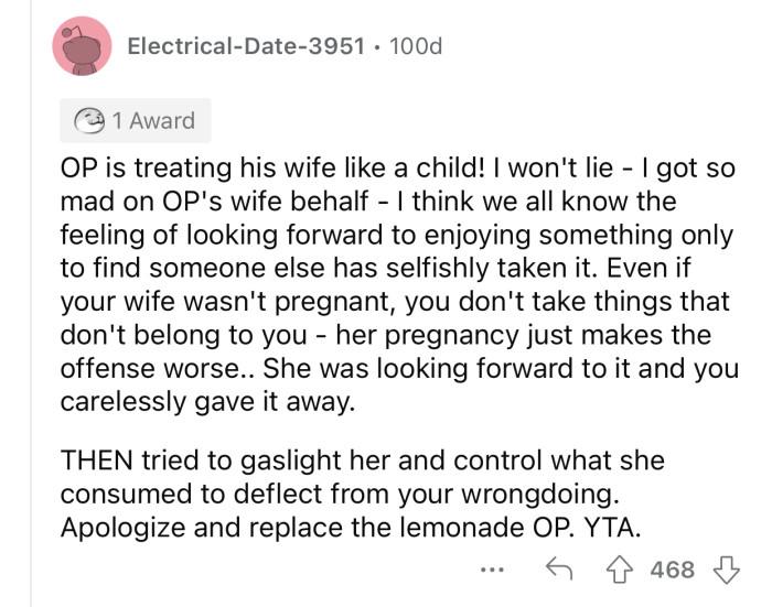 This scenario highlights the emotional complexities surrounding pregnancy cravings. The husband's decision not to replace the lemonade reflects a common misunderstanding of how cravings can impact emotional well-being during pregnancy.