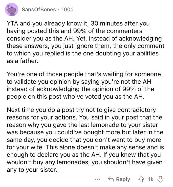 Reddit: r/AmItheA**holeOP allowed his sister to take the last can of lemonade and refused to replace it.