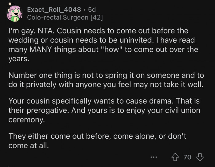 Moreover, the notion of timing in this context is crucial. According to Dr. Michele Weiner-Davis, a renowned marriage therapist, "Timing is everything when it comes to discussing sensitive topics. It's essential to create a safe space for open dialogue." Research from her practice emphasizes that introducing sensitive topics, such as a family member's sexual orientation, requires strategic consideration to avoid misunderstandings. Dr. Weiner-Davis notes that "clear communication can significantly reduce anxiety and misunderstandings in potentially volatile family discussions" (source: divorcebusting.com). Thus, a proactive approach—discussing the cousin's coming out beforehand—may help create a supportive environment, minimizing the risk of drama during the wedding celebration.