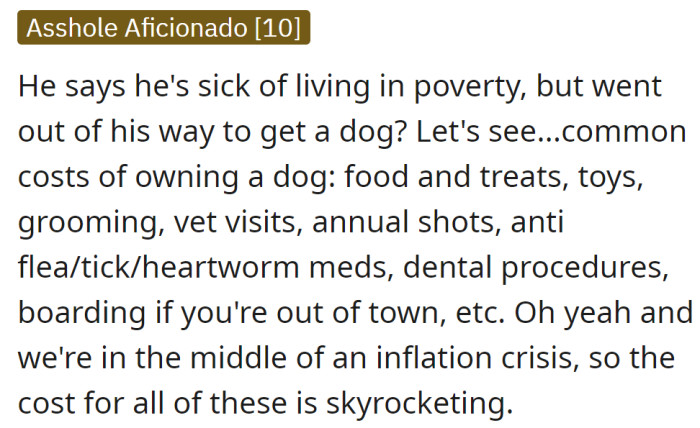 "He says he's sick of living in poverty, but went out of his way to get a dog?"
