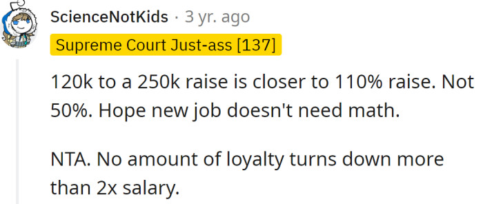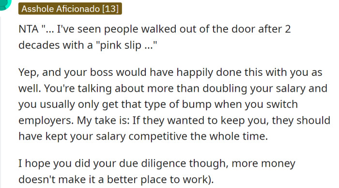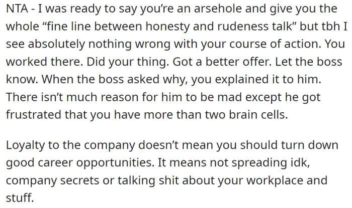 Redditors supported the OP's decision and told them they were not wrong for choosing what was personally better for them. As far as 'loyalty at the job' is concerned, Redditors explained that it's usually a one-way street that implies employees owe loyalty to the company, but rarely vice versa.