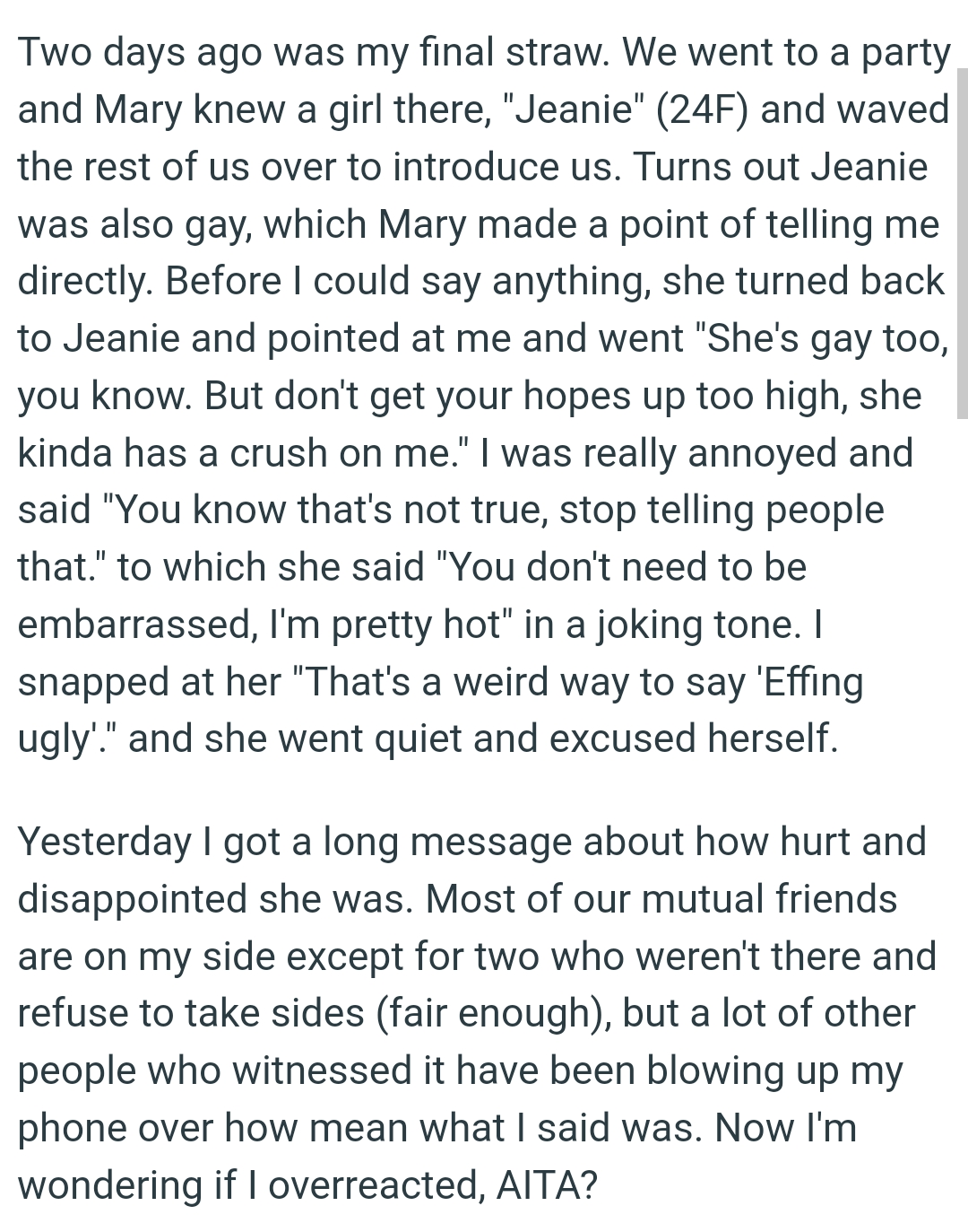 Mary would go around telling whoever cared to listen how she was OP's gay awakening because, apparently, it was a really weird coincidence that OP came out right after she joined the friend group. The OP had warned her several times to stop, but she continued.