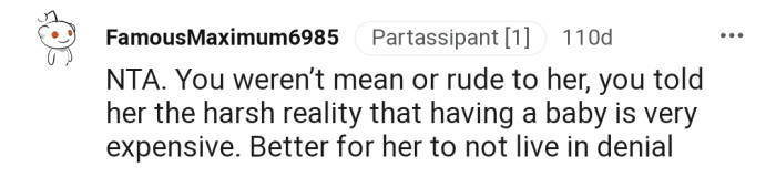 "You weren’t mean or rude to her, you told her the harsh reality that having a baby is very expensive."