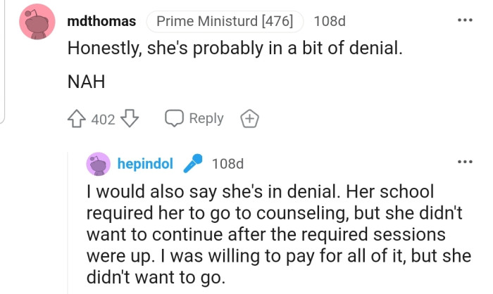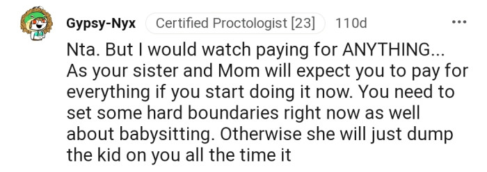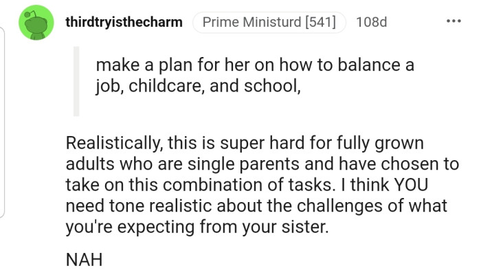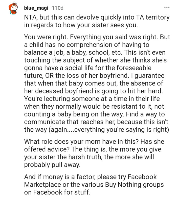 For the Redditor, employing such strategies could facilitate a more constructive conversation with their sister. Instead of expressing frustration, they could express concern for her well-being and offer support in finding affordable solutions. Research shows that active listening and validation of feelings can decrease defensiveness and promote a more collaborative problem-solving approach (Rogers & Farson, 1987). Ultimately, fostering a supportive atmosphere can help both siblings navigate the complexities of impending parenthood together.