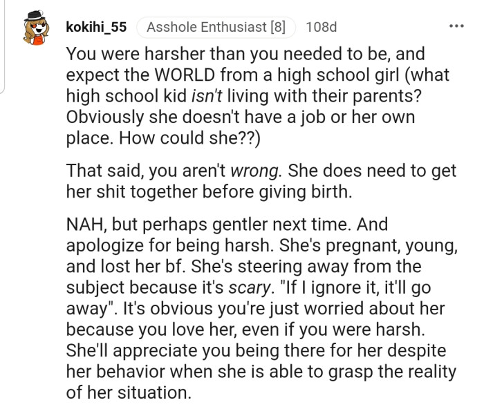 "NAH, but perhaps gentler next time. And apologize for being harsh. She's pregnant, young, and lost her bf"