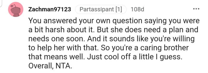 "You answered your own question saying you were a bit harsh about it. But she does need a plan and needs one soon."