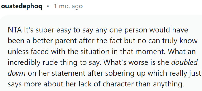 OP, however, could not let the insensitive remark pass unchallenged. A heated confrontation ensued between OP and the woman, ultimately resulting in her being asked to leave the party.