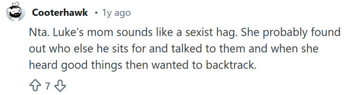 They also noted that no other parent had ever raised concerns about Mike, who occasionally works for other families. Weeks later, the OP ran into Luke’s mom again—this time, she asked if Mike could babysit for her since her sitter situation had fallen apart.
