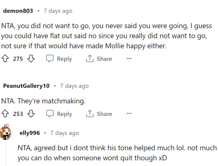 OP's frustration toward Mollie's persistent attempts to get him to attend is understandable. His choice to stay home should have been respected, especially considering his initial response was a 'maybe,' not a definitive 'yes.'