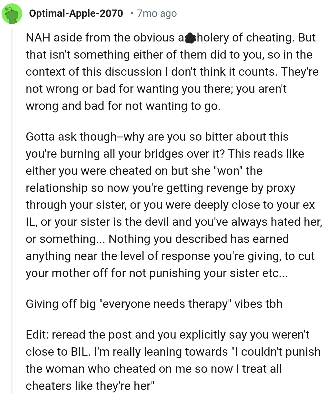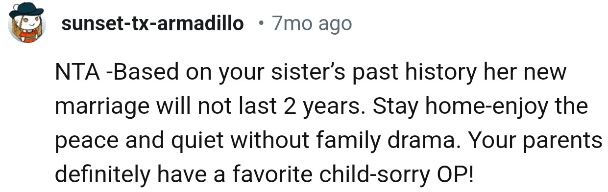 His sister, predictably, erupted. In a heated exchange, OP questioned their parents’ eagerness to bankroll her second wedding, and to a cheater nonetheless. Tensions flared, and he hightailed it back to New York.