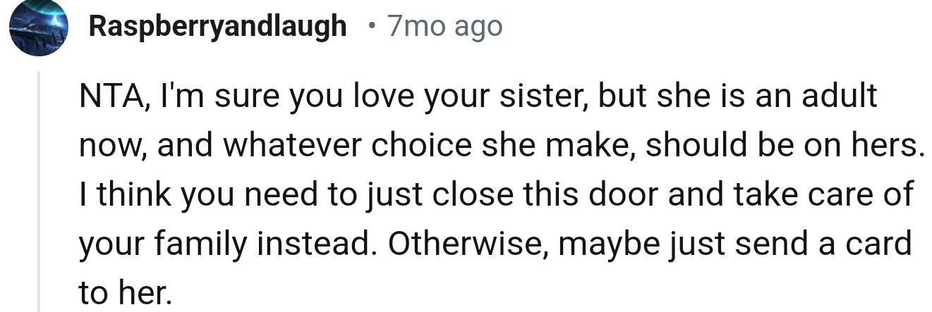 Redditors were solidly on OP’s side. Some situations require drawing hard lines, even when it’s your own family on the other side. They agreed this was definitely one of them.