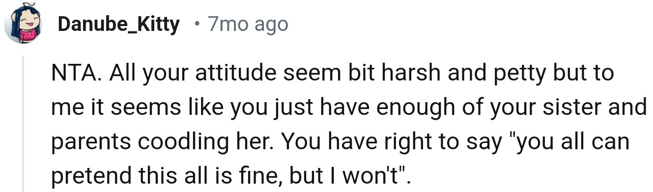 "It seems like you’ve just had enough of your sister and parents coddling her"