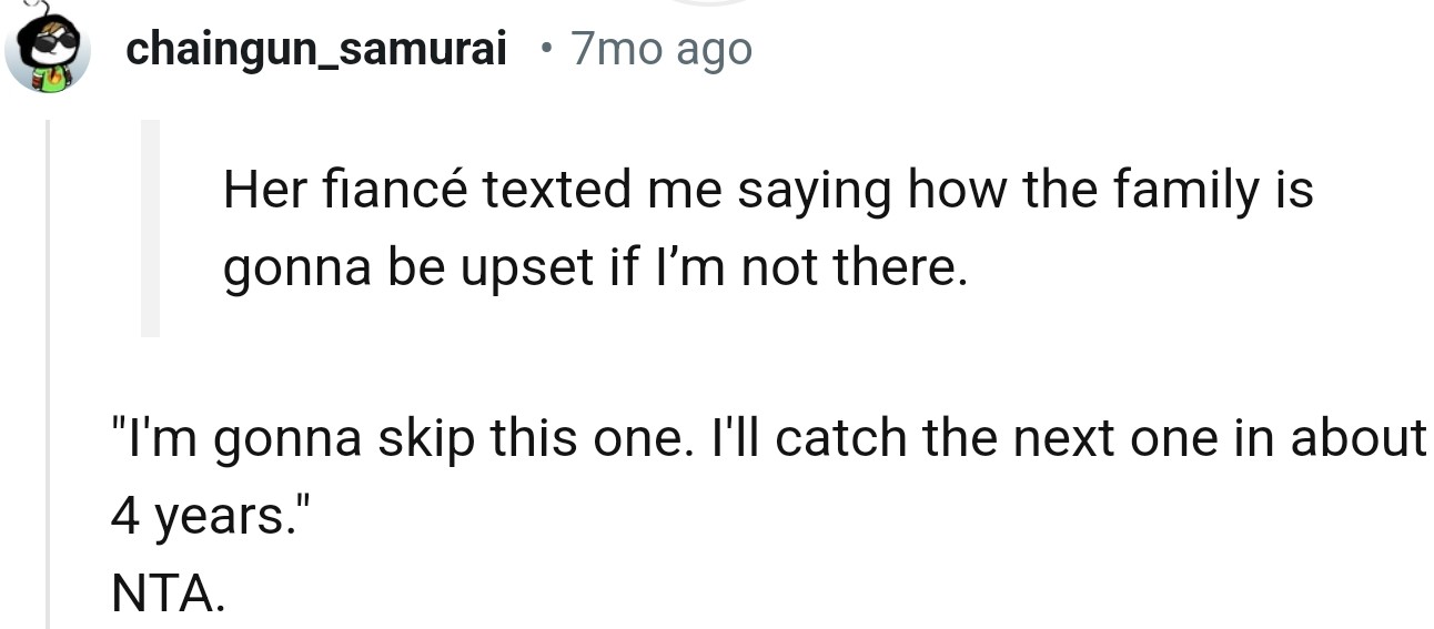 Understandably miffed, OP kept his distance from this ‘fiancé,’ who then dared to ask if he’d be a groomsman. The response? A firm no, of course.