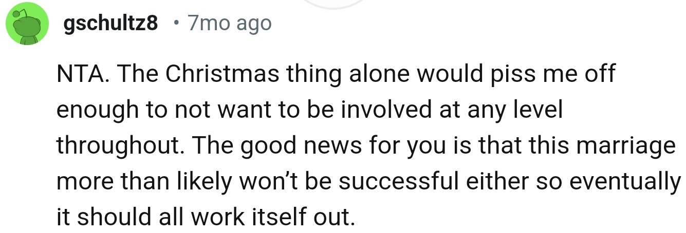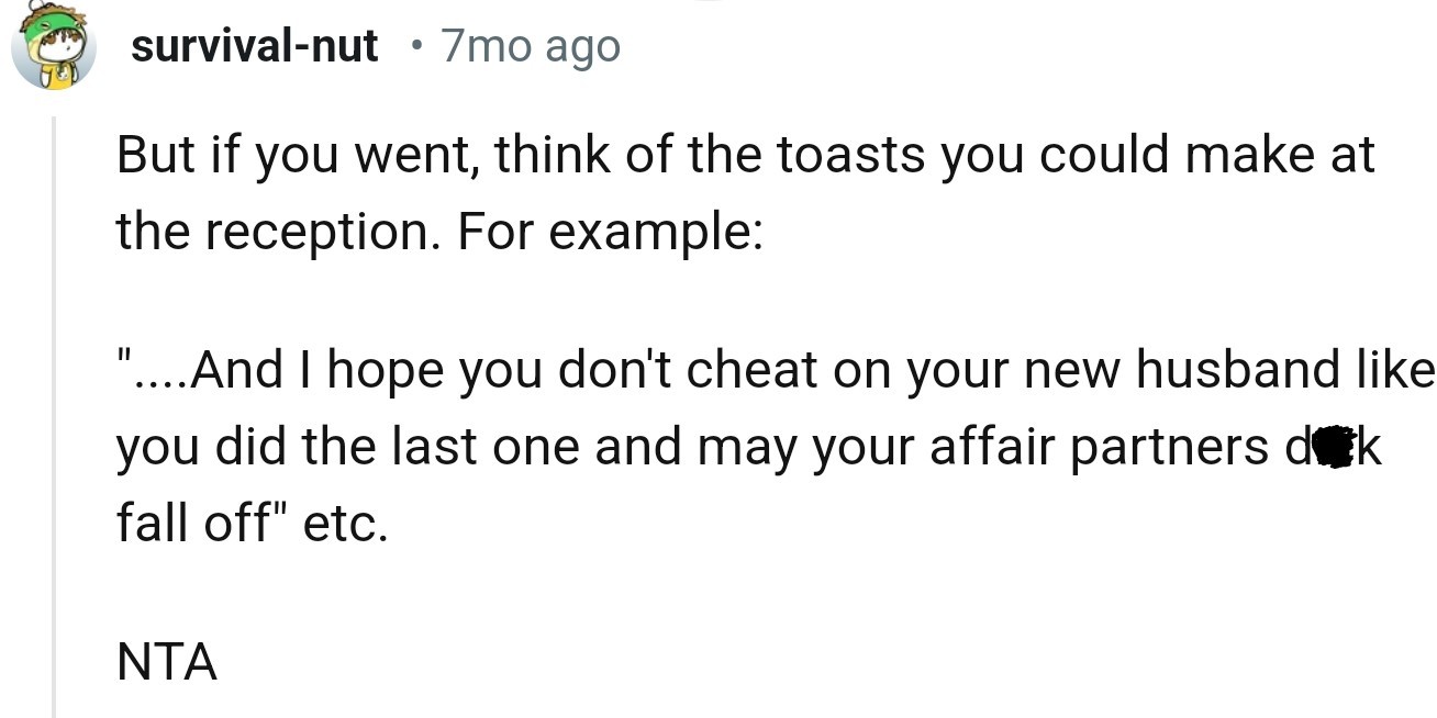 For some strange reason, everyone believed OP would come around, but he wasn’t about to drop a dime on a wedding between cheaters. When Christmas plans shifted to include the new in-laws, OP couldn’t help but laugh.