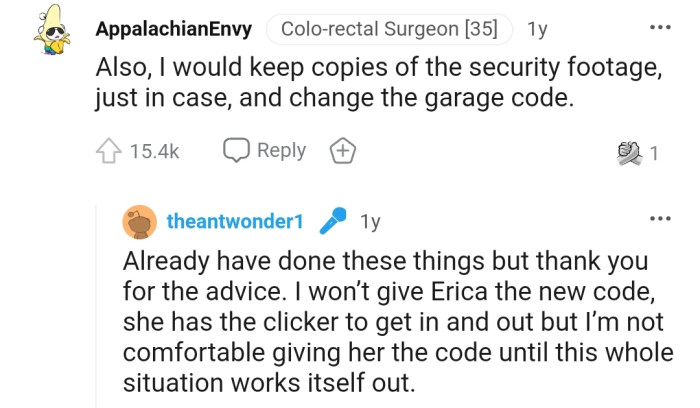"I would keep copies of the security footage, just in case, and change the garage code."
