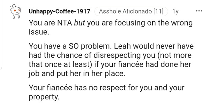 "Leah would never have had the chance to disrespect you if your fiancée had done her job and put her in her place."
