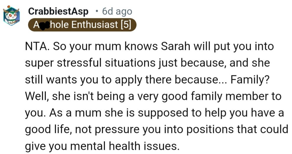 Redditors argued that if anyone was devaluing family, it was OP’s mom for wanting him to endure Sarah’s abuse. Many were alarmed that her dictatorship had been overlooked for over a decade.
