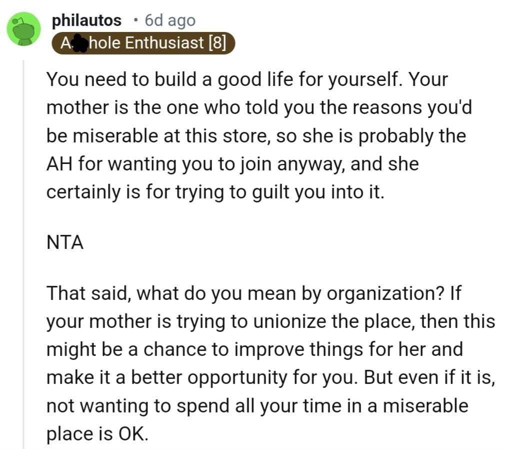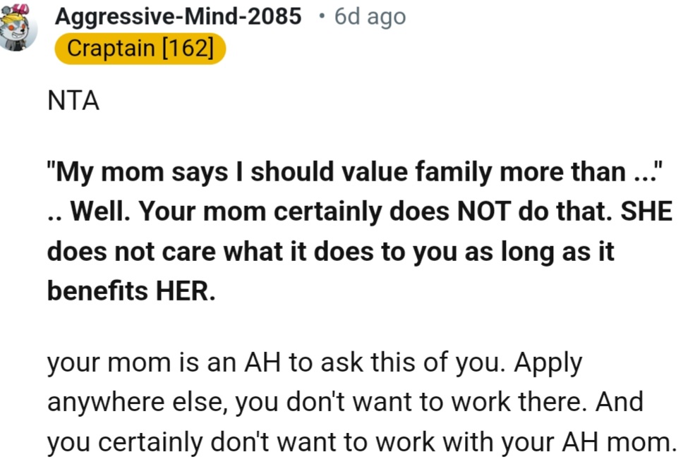 He confessed he couldn’t sleep anymore, haunted by the fear of facing another shift under Sarah’s oppressive thumb. This was why it came as a shock to OP when his mom insisted he join their team. Wait, what?