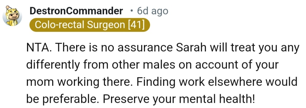 "There is no assurance Sarah will treat you any differently from other males on account of your mom working there"