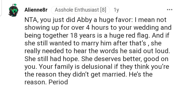 "Your family is delusional if they think you’re the reason they didn’t get married. He’s the reason. Period"