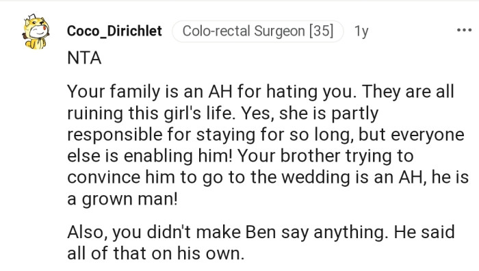 They also expressed their disappointment and criticism toward OP's family for their part in enabling Ben's behavior. From their point of view, the family's actions have contributed to prolonging the pain and disappointment that Abby has faced over the years.