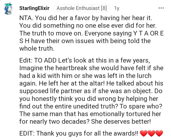 In a remarkable twist, the Reddit community has declared OP innocent, applauding his courage and conviction in exposing the truth. The commenters fervently believe that OP did the right thing by bringing Abby's long-suffering relationship to an end.