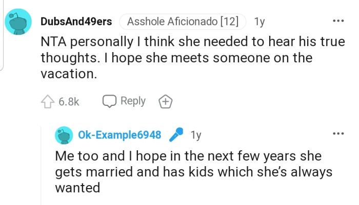 "NTA. Personally, I think she needed to hear his true thoughts."