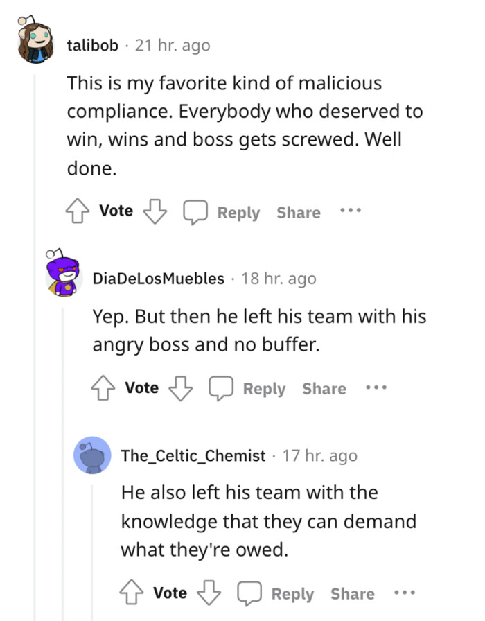 "Everyone who deserved to win, wins and the boss gets screwed. Well done"
