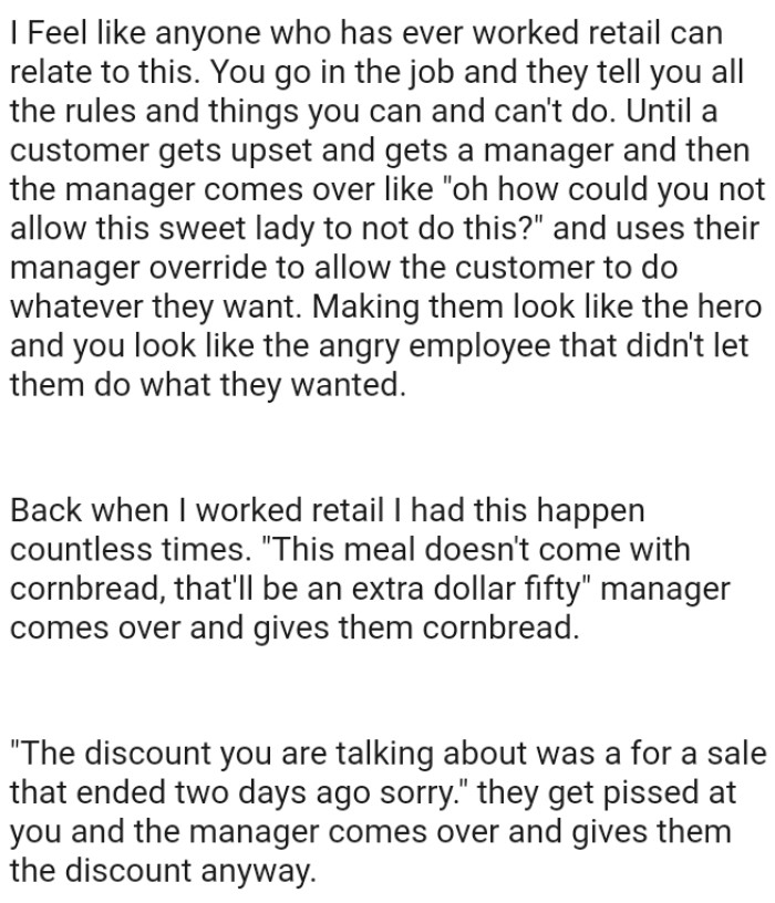 The OP works in retail, and the story discusses how one goes about the job, detailing all the rules and things one can and cannot do. Then a customer gets upset, calls a manager, and the manager comes over and breaks those same rules.