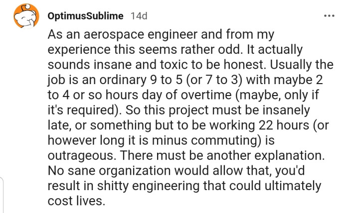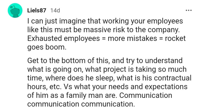 "I can just imagine that working your employees like this must be a massive risk to the company. Exhausted employees = more mistakes."