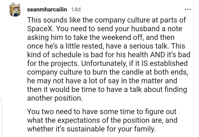 "You need to send your husband a note asking him to take the weekend off, and then once he’s a little rested, have a serious talk."