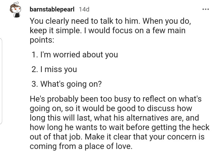 "You clearly need to talk to him. Make it clear that your concern is coming from a place of love."