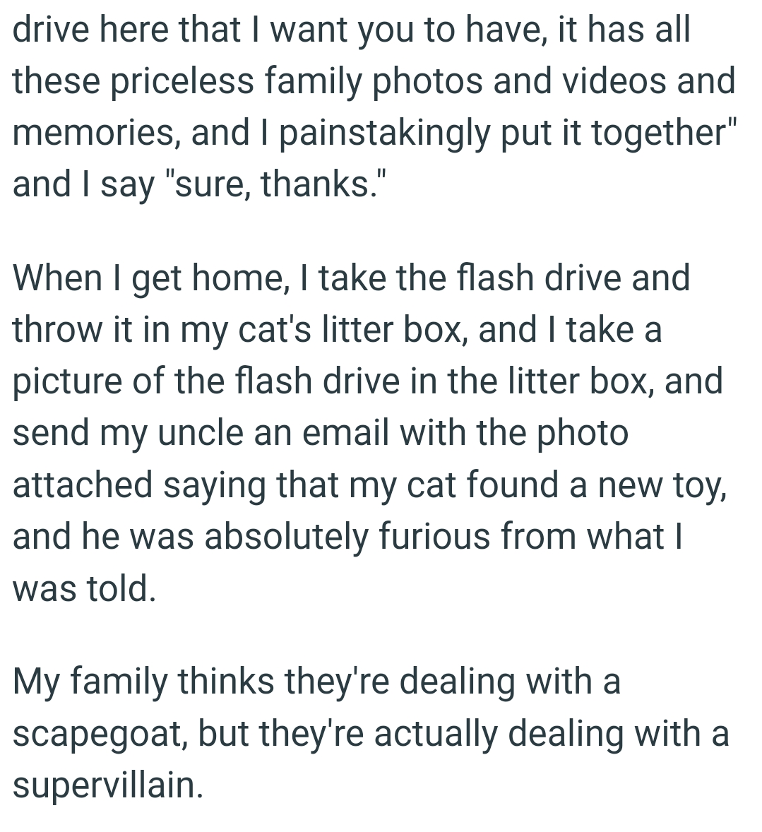 OP's uncle painstakingly put it together, only for OP to collect it and throw it in her cat's litter box. What she did next will shock you!