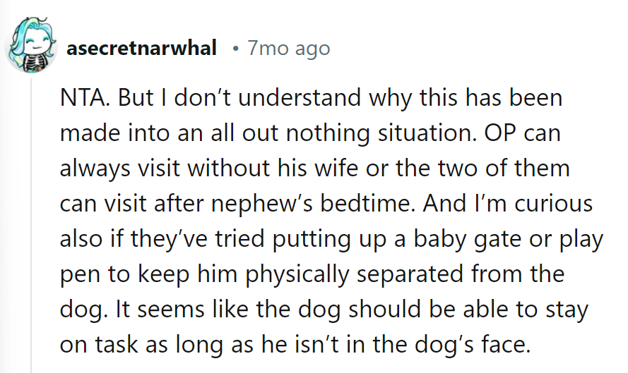 This very scenario unfolded in a Reddit post where a man decided to avoid visiting his nephew to protect his wife's service dog from distractions. The dog is not just a pet but a vital support for his wife, who has serious medical issues.
